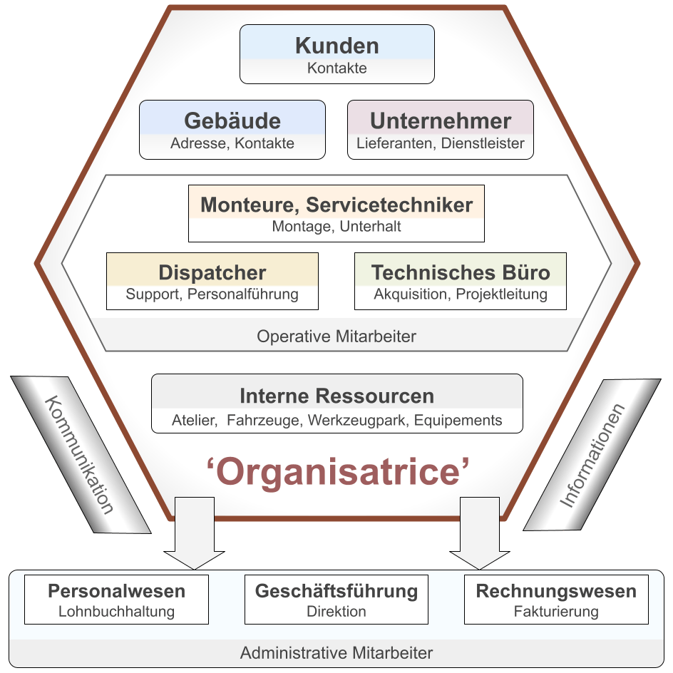 Aus Sicht eines Kundendienst-Mitarbeiters ist nicht der Auftrag das zentrale Modul, sondern der Kunde. Nicht desto trotz braucht er genau so Zugang zu all den Informationen der korrelierten Module. 'Organisatrice' regelt diese Informationslogistik auf intelligente Weise und serviert dem Benutzer die jeweilig geeignete Informations-Perspektive