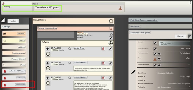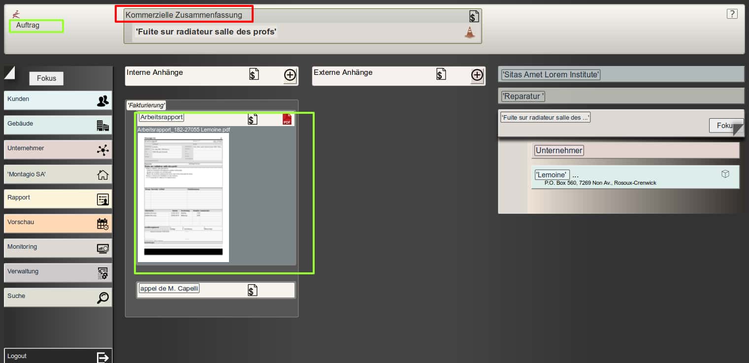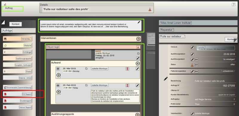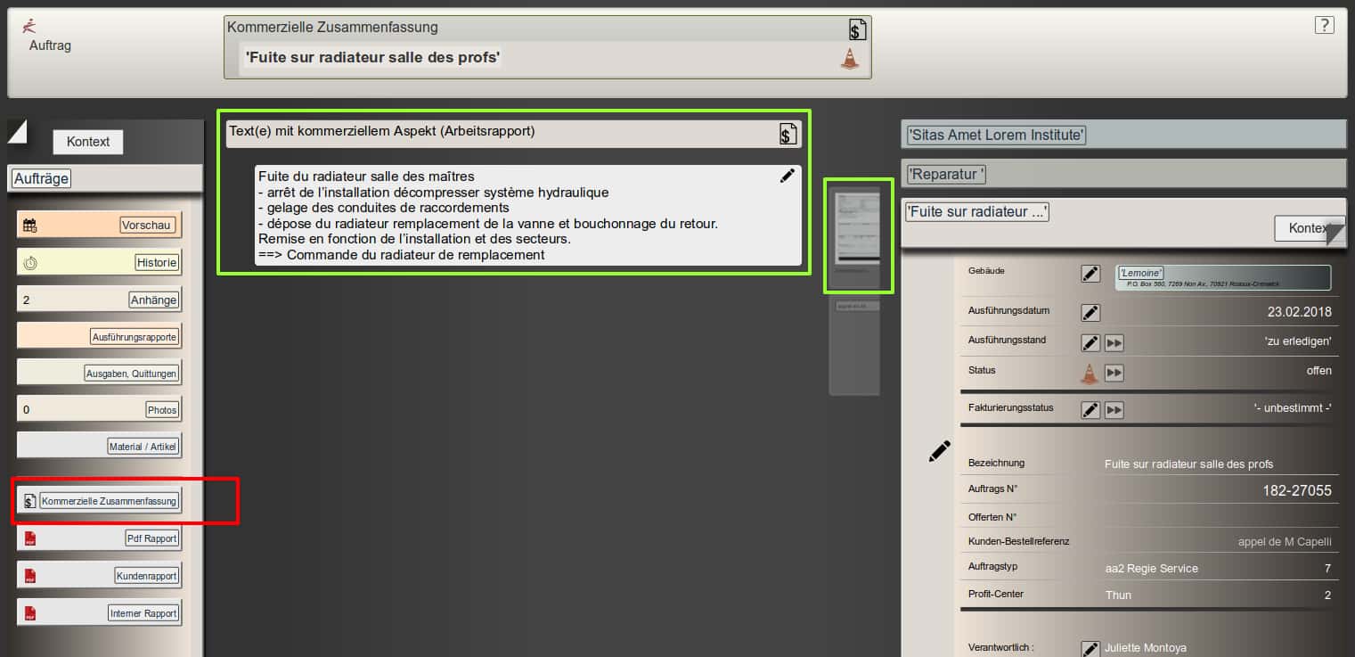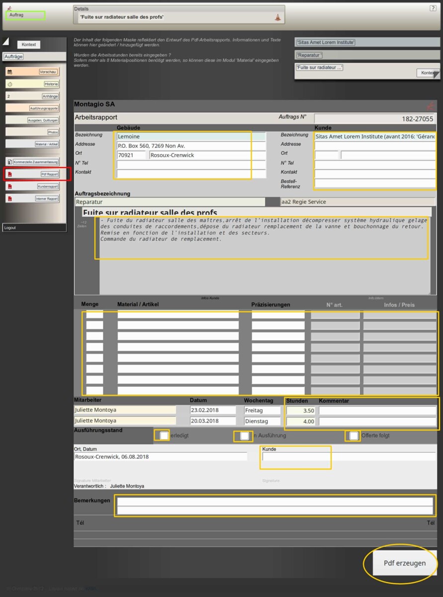 Der generierte Pdf-Rapport wird automatisch als 'Arbeitsrapport' diesem Auftrag angeheftet und als 'KOMMERZIELL' markiert.
