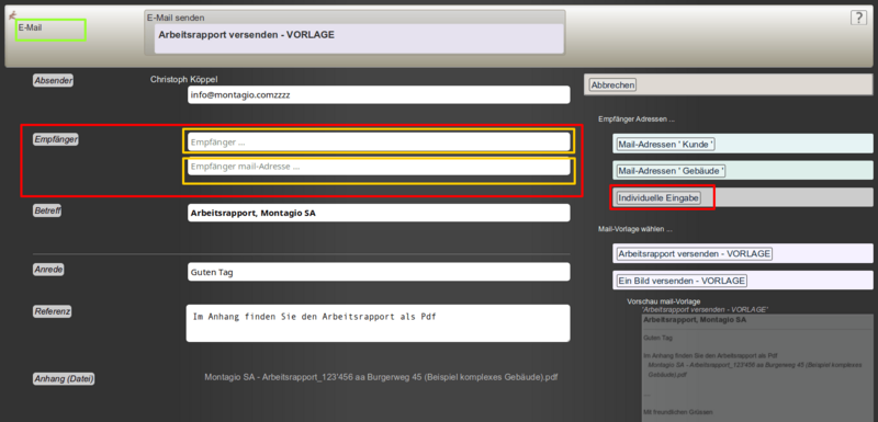 Will man die Mail-Adresse individuell eingeben, so wählt man den 'individuelle Eingabe' Vorwahl-Knopf'