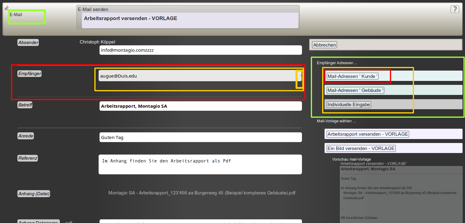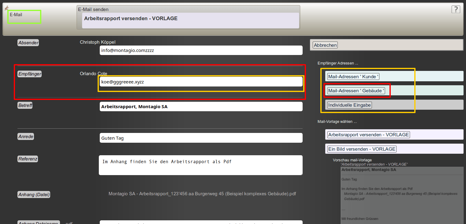 Mail-Adressen aus 'korrelierten Gebäuden' des Auftrags können über die entsprechende Vorwahl-Schaltfläche angewählt werden
