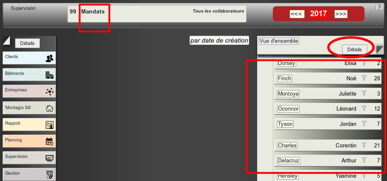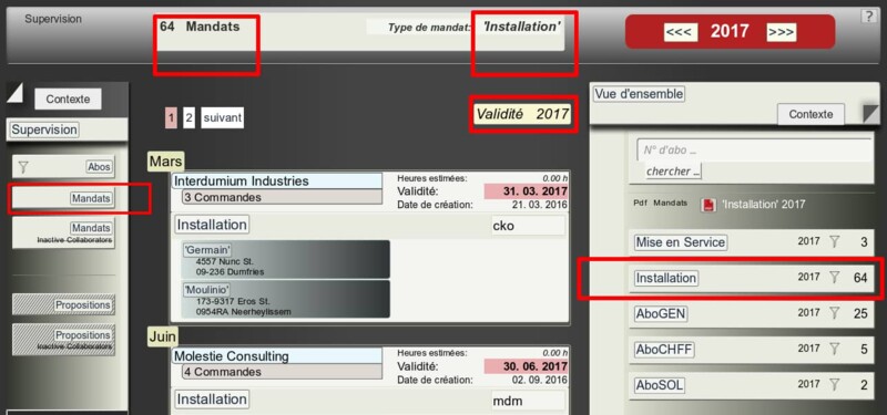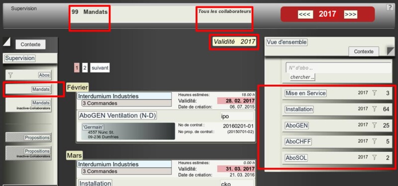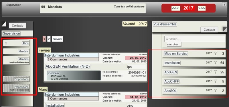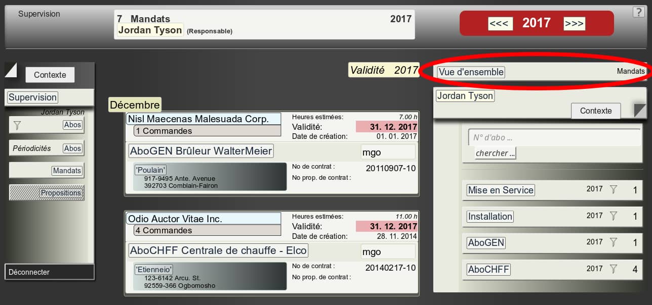 Dans le suivi, ces mandats peuvent être visualisés filtrés par la responsabilité. La date de validité est normalement fixée à la fin de l'année, mais peut également être asynchrone par rapport à l'année civile, le cas échéant.