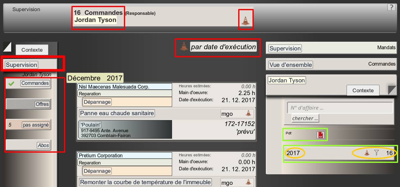 L'employé peut également estimer sa charge de travail, car le nombre de commandes " ouvertes " est une indication de sa charge de travail personnelle. La surveillance globale peut être visualisée par le dispatcher avec des droits d'accès appropriés, par exemple, et est pertinente pour évaluer la situation générale de l'entreprise.